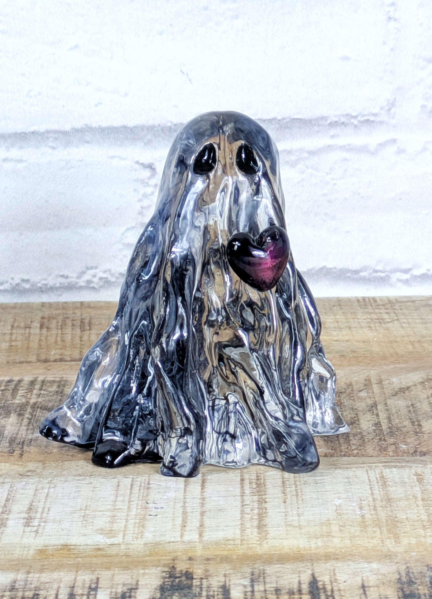 Bring a touch of gothic charm to your décor with this handcrafted resin ghost, finished with a shimmering glass heart embellishment. Standing at 11cm tall, each ghost is poured with smokey pigment, creating unique swirls and patterns — no two are ever alike.